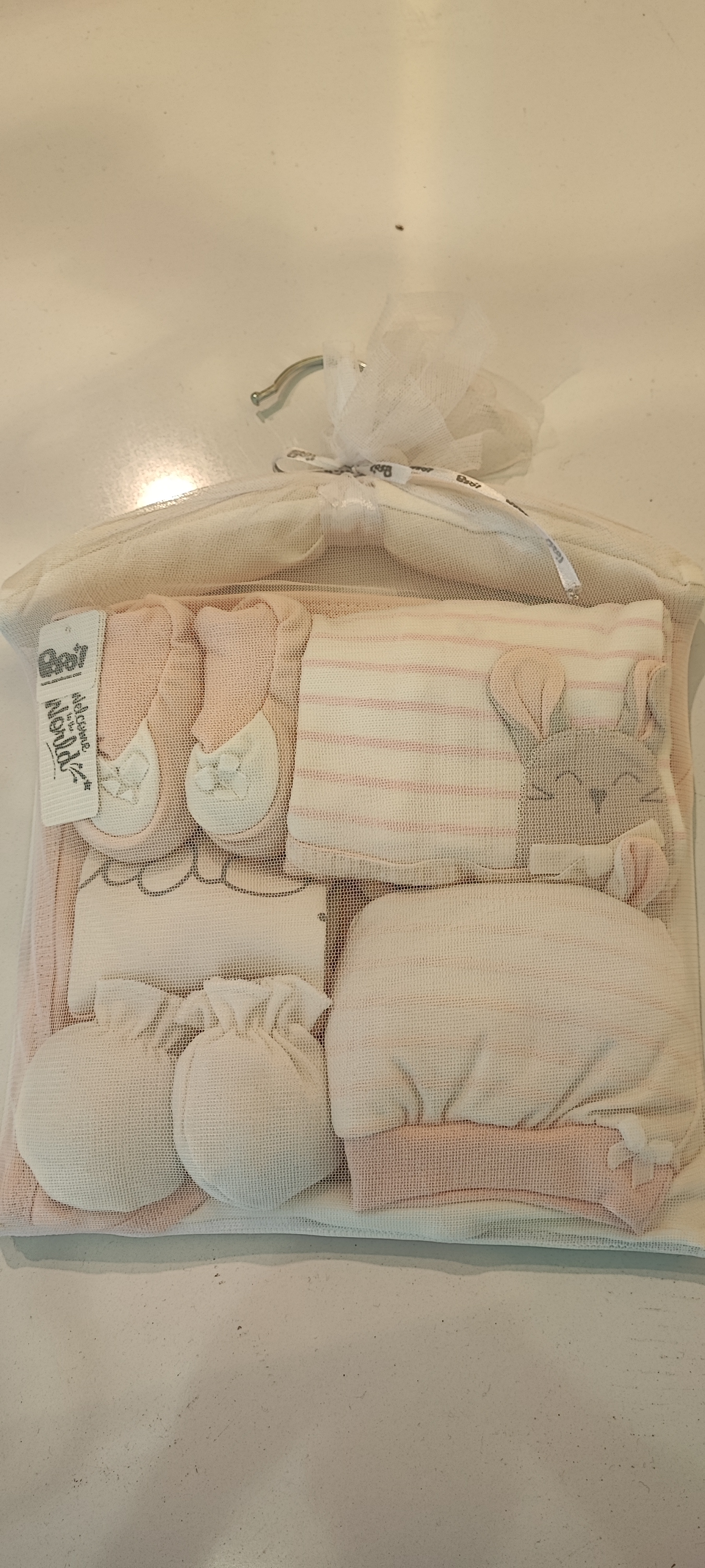 این ست شامل ۷ تکه که تکه ی اصلی این گیفت یک سرهمی همراه با کلاه یک دورپیچ نخی ۵۵*۵۵ سانتی متری و یک کلاه و ست دستکش و پاپوش و چوب لباسی و پیشبند می باشد. که در یک بسته توری گیفت فرار گرفته است. که مناسب برای هدیه دادن به نوزادان تازه متولد شده در بیمارستان می باشد. این محصول برای نوزادان با وزن نرمال ۲٫۸ تا ۵ کیلوگرم مناسب می باشد.
