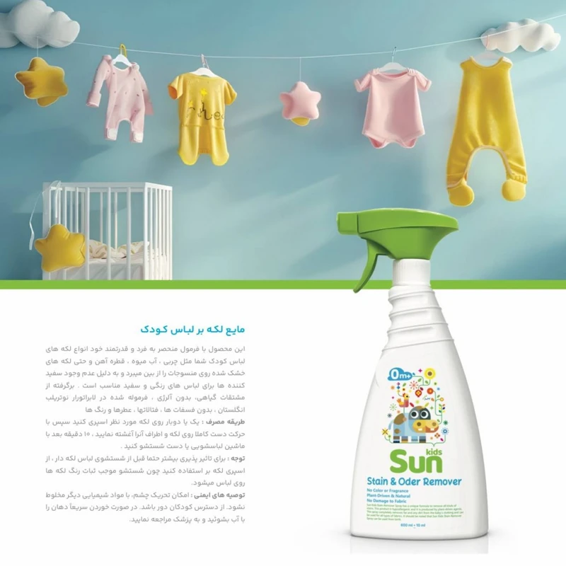 اسپری لکه بر لباس سان کیدز Sun Kids بر پایه گیاهی تولید شده است ، مواد ترکیبی آن از بهترین و با کیفیت ترین مواد تولید شده است تا با پوست حساس و لطیف کودک سازگاری داشته باشد. این اسپری لباس حجمی معادل 600 میلی لیتر دارد که صرفه اقتصادی آن را بالاتر برده است. لکه بر لباس سان کیدز دارای فرمولاسیون ویژه ای می باشد که با اکسیژن فعال برای از بین بردن لکه های مختلف مناسب است. این اسپری برای انواع پارچه ها قابل استفاده می باشد که گفتنی است لباس را بدون ایجاد لک و رنگ روی پارچه تمیز می کند. از این مایع لکه بر می توانید برای همه لباس های از جمله بزرگسالان و هر پارچه و حتی فرش نیز استفاده کنید